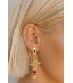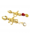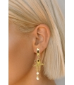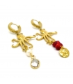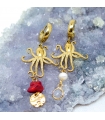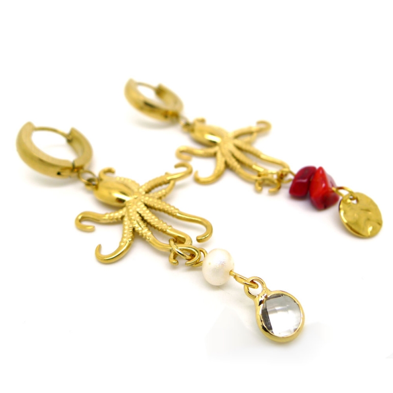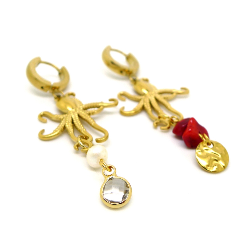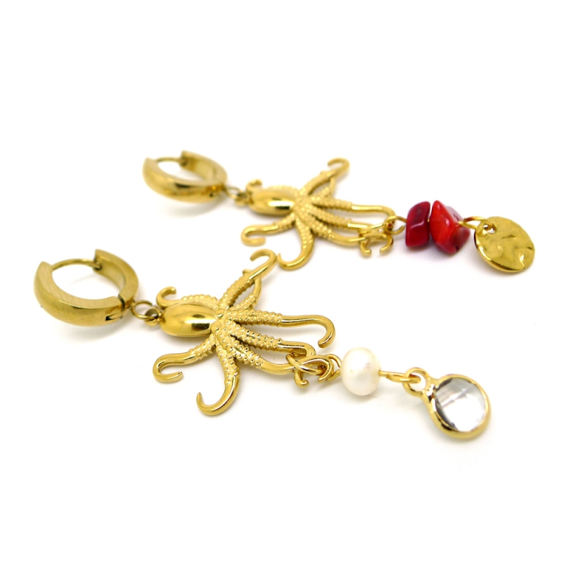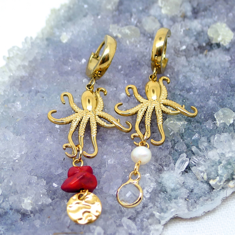 Add a bold marine touch to your look with these asymmetrical earrings featuring gold stainless steel hoops, octopus charms, freshwater pearls, and sea bamboo stones.