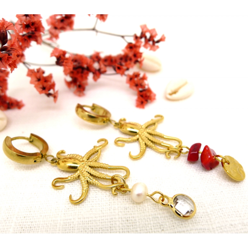 These earrings feature octopus charms, freshwater pearls, and sea bamboo, all mounted on small gold stainless steel hoops.