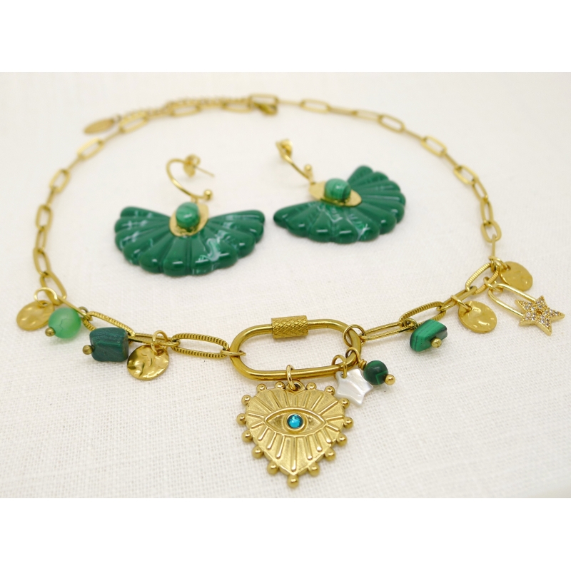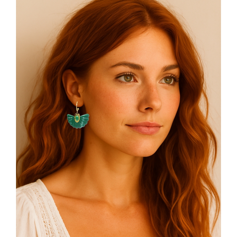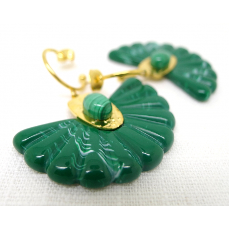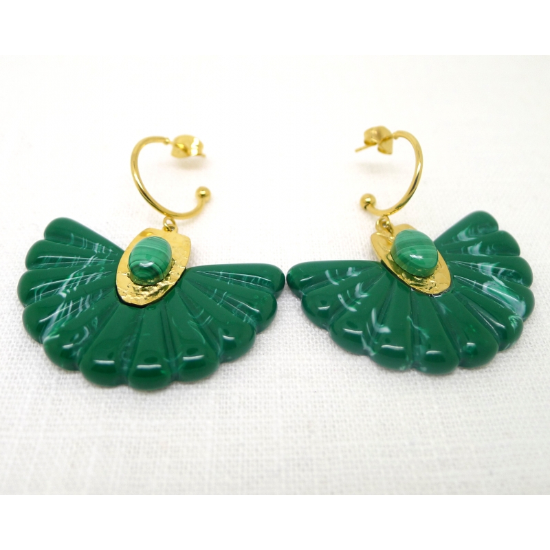 Let yourself be charmed by the refinement of these golden earrings, featuring marbled green fan pendants and a malachite cabochon. A bold, graphic piece that blends texture, color, and shine to elevate any outfit.