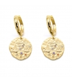 Boucles d'oreilles Médailles en laiton doré à l'or fin 16 carats et zircons de différentes couleurs. Signe zodiaque de la Balance : 23 Septembre au 22 Octobre.