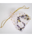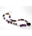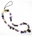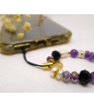 Bracelet de portable en pierre gemme (Améthyste, onyx), verre facetté, nacre, perles d'eau douce et acier inoxydable doré ainsi qu'une médaille martelée.